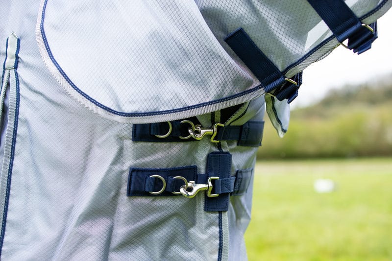 A superb new design from Swish - Our cooling fly rug is made from extremely lightweight and breathable nylon. Designed to offer sun and fly protection without overheating your horse. It is UV reflective and can be warn in warmer weather. The large shoulder gusset allows for freedom of movement, while the large tail flap offers extra protection. A longer cut, detachable neck cover with nylon strip to protect your horses mane. The neck cover ensures your horse gets maximum coverage even when grazing and is secured with double locking Velcro straps. The shoulders are nylon lined to protect and prevent rubbing.